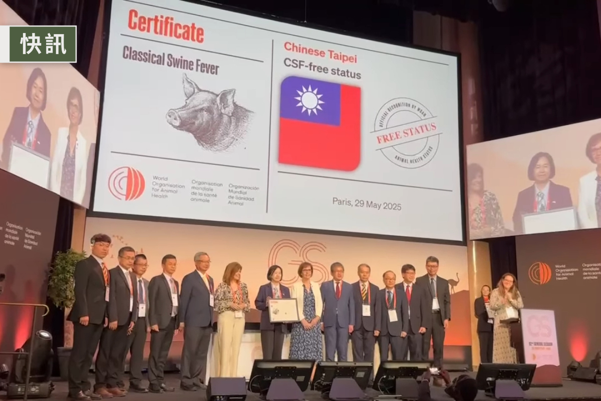 第92屆世界動物衛生組織(World Organisation for Animal Health,簡稱WOAH)年會於5月25日至29日於法國巴黎舉行,台灣於會中正式獲得「豬瘟非疫國」認證,繼取得WOAH正式認可的口蹄疫、非洲豬瘟非疫區地位後,台灣成為亞洲唯一同時達標的「三大豬病非疫區國家」。