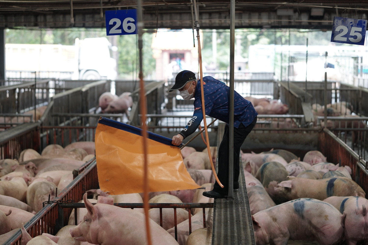 抵達拍賣市場後,豬隻們會被驅趕至繫留欄,交由拍賣市場人員處理,預備進入拍賣程序。