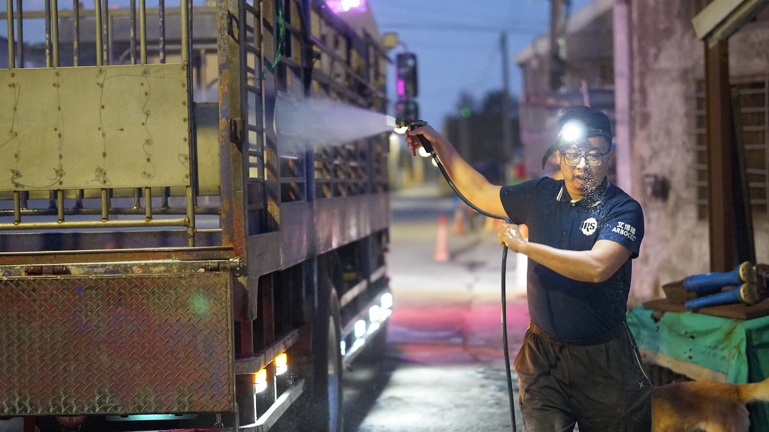 清晨,雲林田間小路內,一台帶著滿滿強光裝飾的運輸車駛來,劃破黑暗的寧靜。
