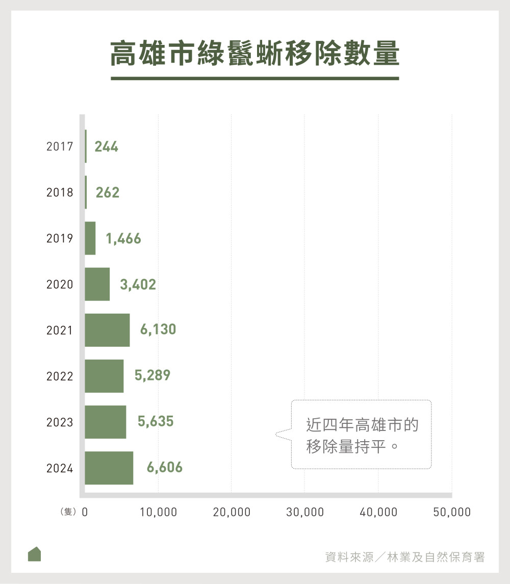 林保署的顧慮也有其根據,因爲從捕捉數量來看,高雄市連續四年維持在5、6000隻綠鬣蜥,和其他核心區域嘉義、台南、屏東的移除量與成長幅度都相去甚遠。