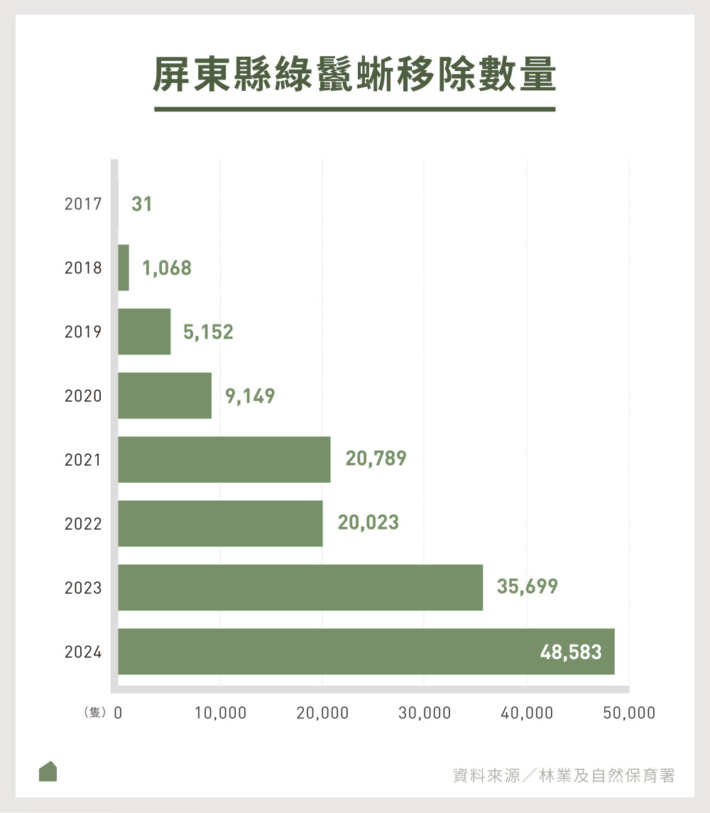 2023年全台移除5萬7739隻綠鬣蜥、2024年移除8萬2595隻,是林保署設定兩年4萬隻目標的3.5倍,這些預算被期待要能移除新分布區域的個體、削減核心區域的族群量;而農業部又再做出承諾,今年移除12萬隻,想藉更高強度的移除手段控制族群。