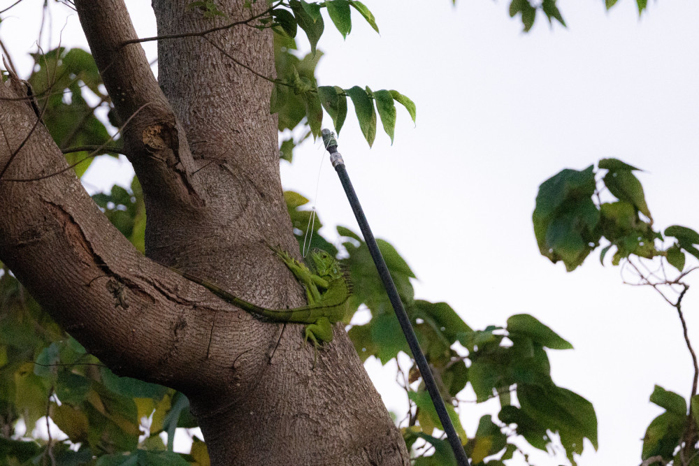 記者站在樹下拍攝,移除人員提醒留意頭頂上的綠鬣蜥:「牠跑去你那邊,要注意!這隻會跳喔!」圖|劉亭妤攝