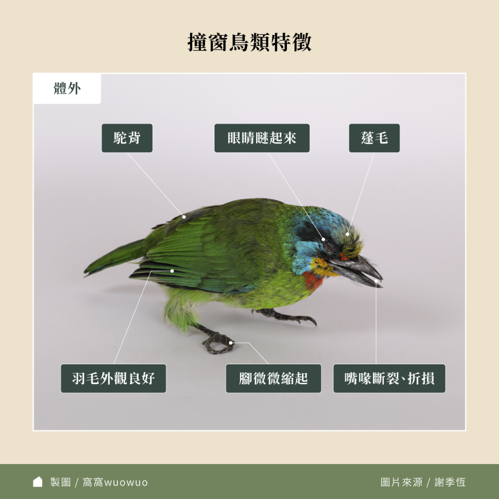 「這一圈的胸毛就很清楚,然後這邊是翅膀,這邊也是翅膀」、「撞窗留下的擦痕,是一點點羽粉加上鳥的體液,比如說血液、組織液,擦出來的痕跡。」