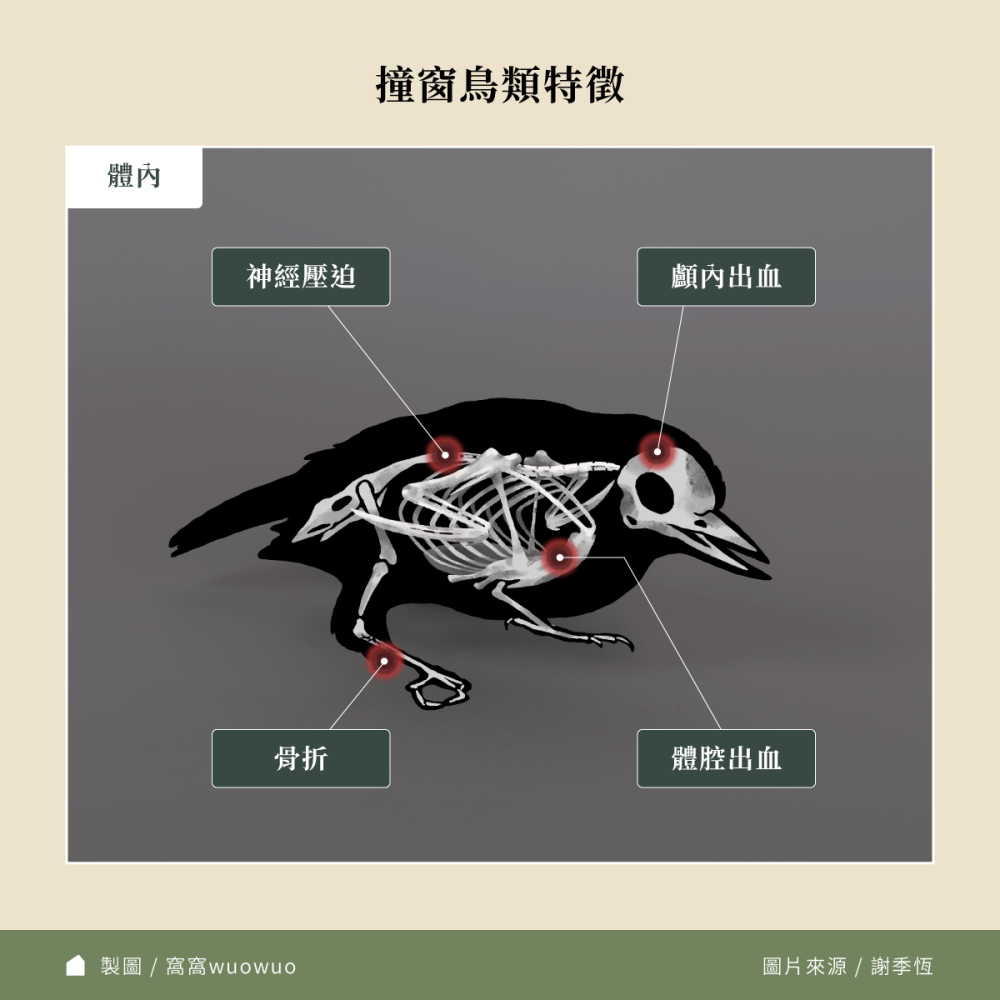 除此之外,王齡敏也從救傷和解剖案例中觀察到,擁有優良體態的健壯個體,可能因為體能好、飛行速度快,相較其他同類撞窗力道更猛烈,死亡率更高。也就是說,窗殺正在反向淘汰族群中較強壯、生存能力較強的鳥。
